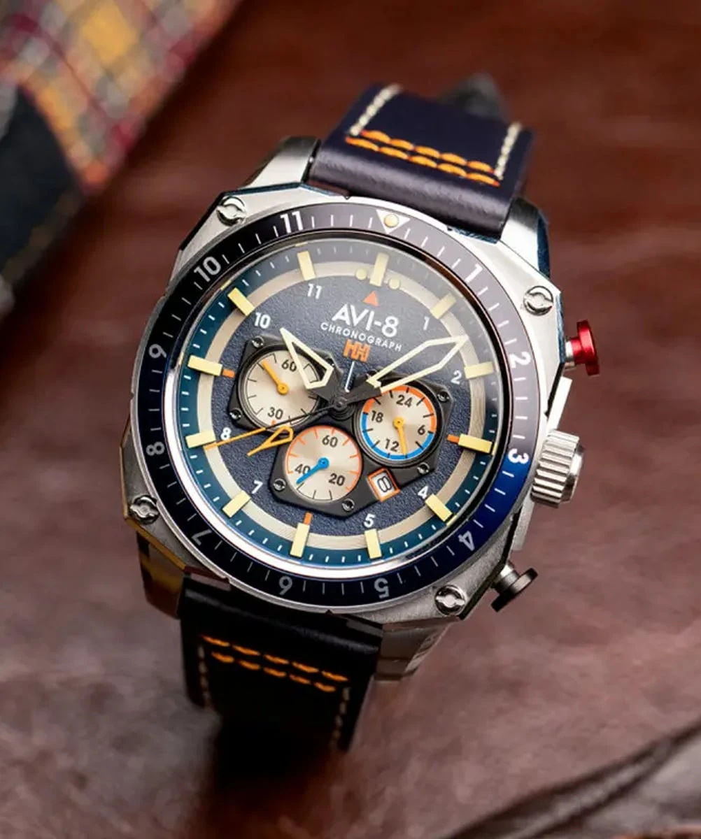 The Hawker Hunter Dual Time Chronograph watch is a remarkable timepiece that combines style and functionality in an elegant manner. This is an Avi-8 men’s watch, reference AV-4100-02, blue in color.
