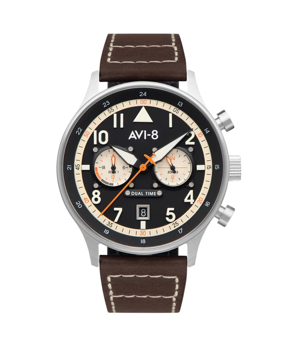 The Hawker Hurricane Dual Time watch is a remarkable timepiece that combines style and functionality in an elegant manner. This is an Avi-8 men’s watch, reference AV-4088-01, brown in color.