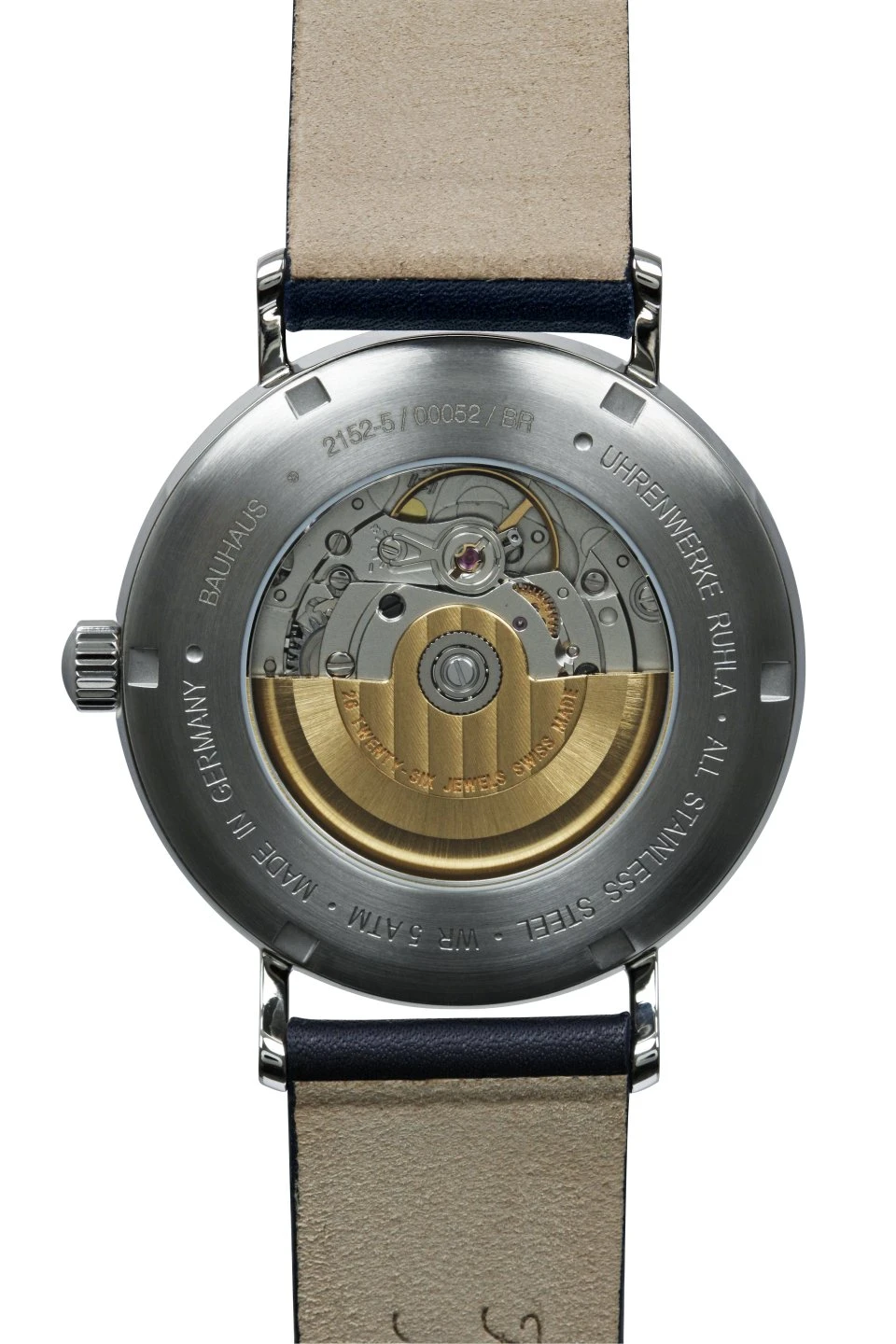 Finally,the bracelet of the watch is a handmade italian leather band in dark blue, with an “Bauhaus” embossing and a length of 20 cm.