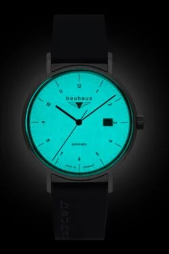 This timepiece has a white dial, highlighted by Minimalist-style stick indexes and surrounded by Arabic numerals. Harmony obliges, the logo “Bauhaus” comes here to be placed in place.