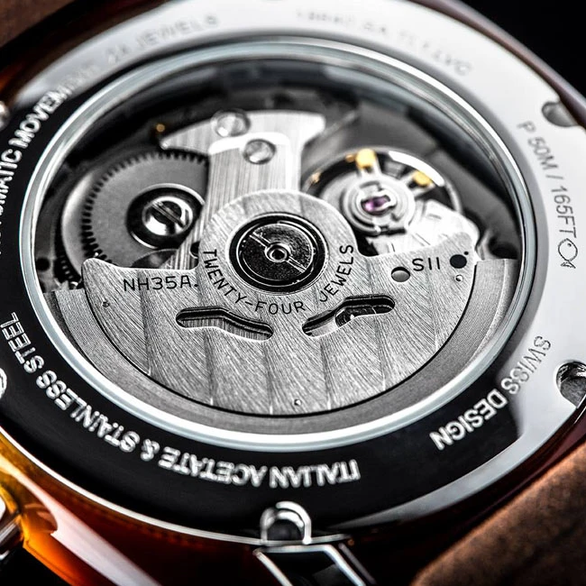 Because this timepiece encloses in its case an automatic movement NH38A, resulting from the precious Japanese factory Seiko. It is thus provided with a power reserve of approximately 40 hours, which means that the watch can continue to function during this period, without necessarily needing to be worn. Also, its second stop system makes it possible to adjust the time with extreme precision.