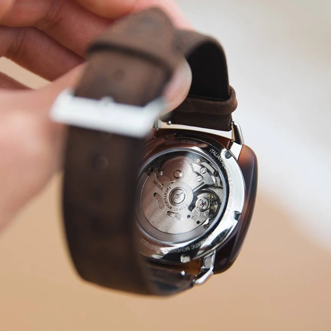 This unisex side of the watch is confirmed in the choice of colors: the grey dial of the watch – which contrasts skillfully with the brown case, is here embellished with a clever opening on the heart of its mechanism. This beating heart reflects the crazy and discreet charm of its ambitious lines. But this contrast is also marked by the refined features of its silver hands which, like two swords that roam the peaks of time, complement the daring blue of his resolutely contemporary second hand.
