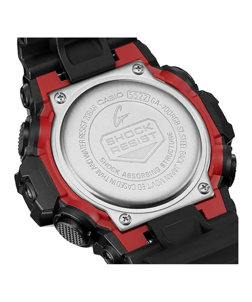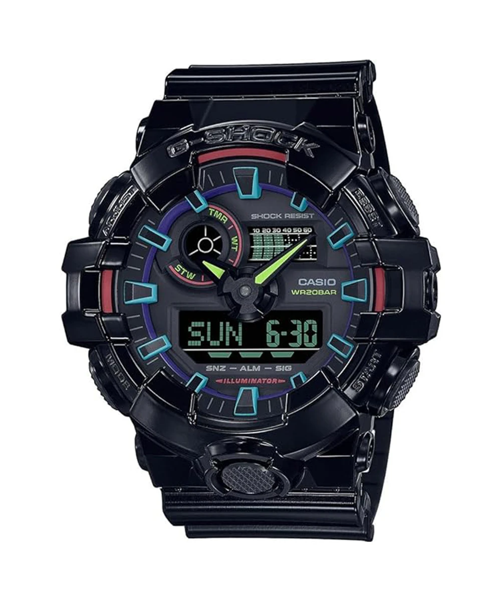 The Casio G-Shock Classic Rgb Watch GA-700RGB-1AER is a high quality watch designed to withstand the most extreme conditions. With a hardened resin case and 200 meter water resistance, this watch is designed for adventurers and professionals who need a reliable and durable watch.