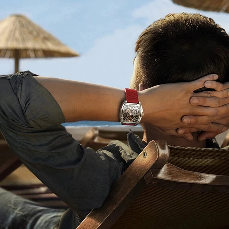 The fourth color brought by the balance wheel and some gears contrasts the whole with finesse and harmony. This hint of gold brings the necessary finish to the style of this CigaDesign Z-series Red to make it a rare product, which can be worn at the office, in the evening or in our daily life.