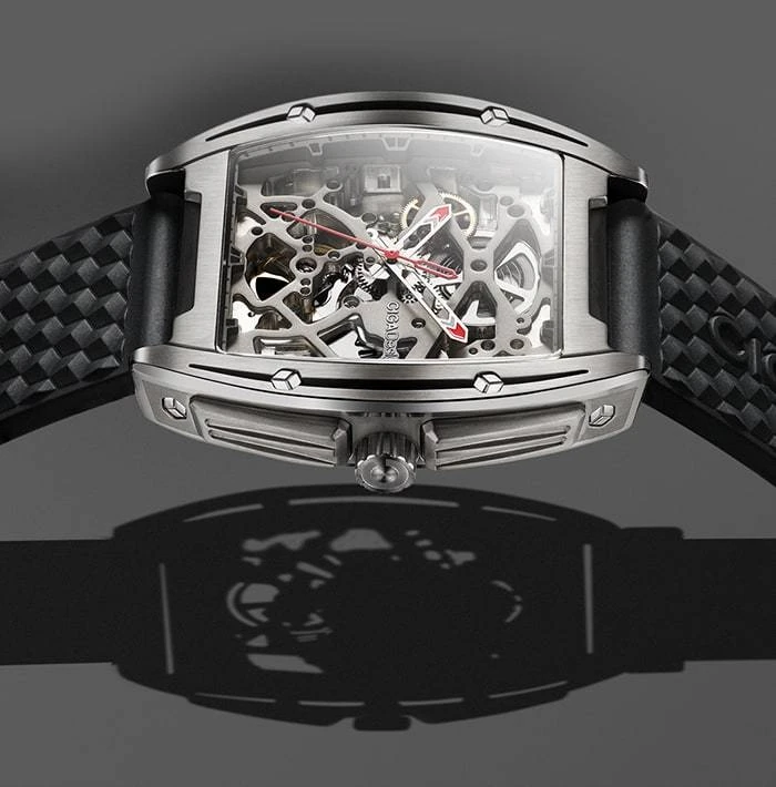 When we discovered this model, the stop-second function surprised our team, but two other details allowed us to send this timepiece directly to the podium of the best skeleton watches…An automatic and manual winding movement, a Seagull Caliber.