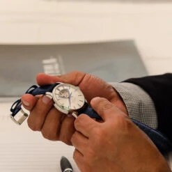 Turning to an opening at noon, the semi-skeleton dial offers both a very classic style from its indexes, but the modern features designed by the brand’s designers reflect a very contemporary timepiece.