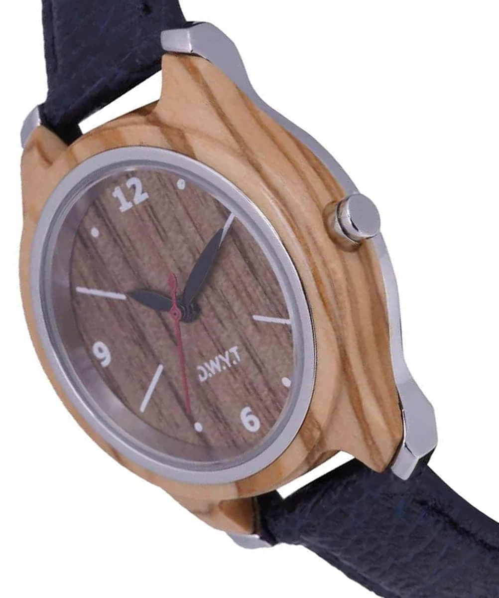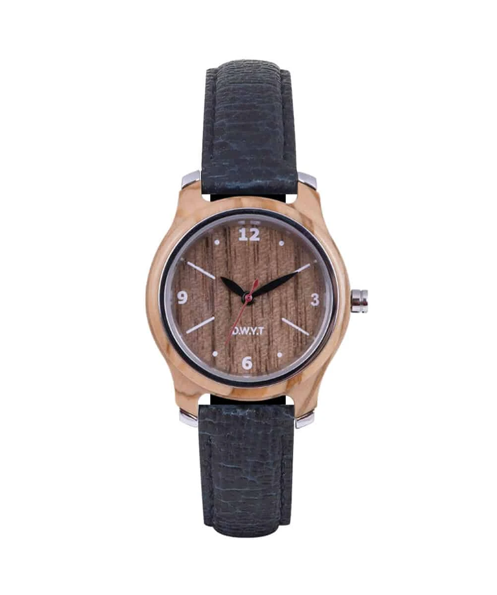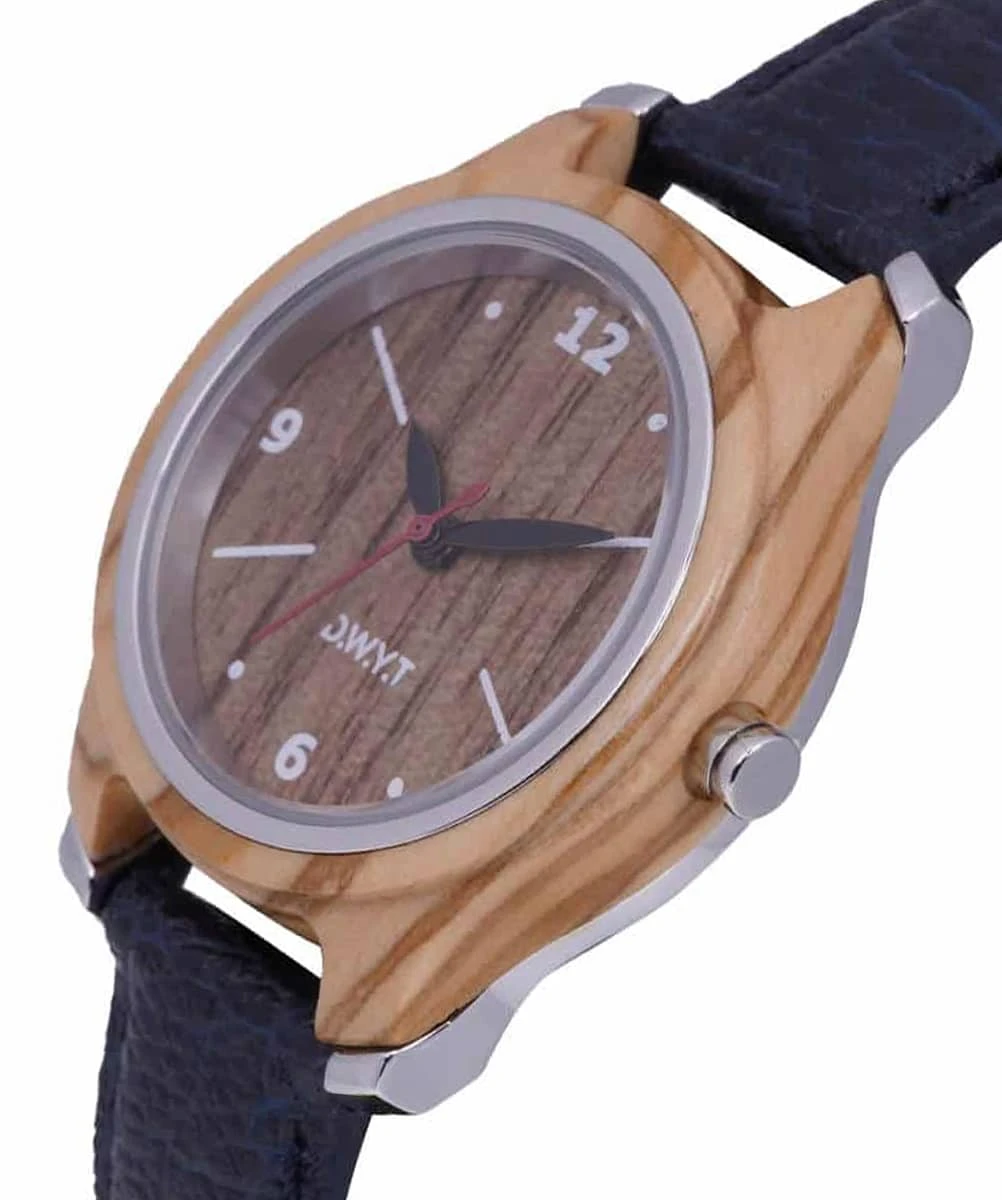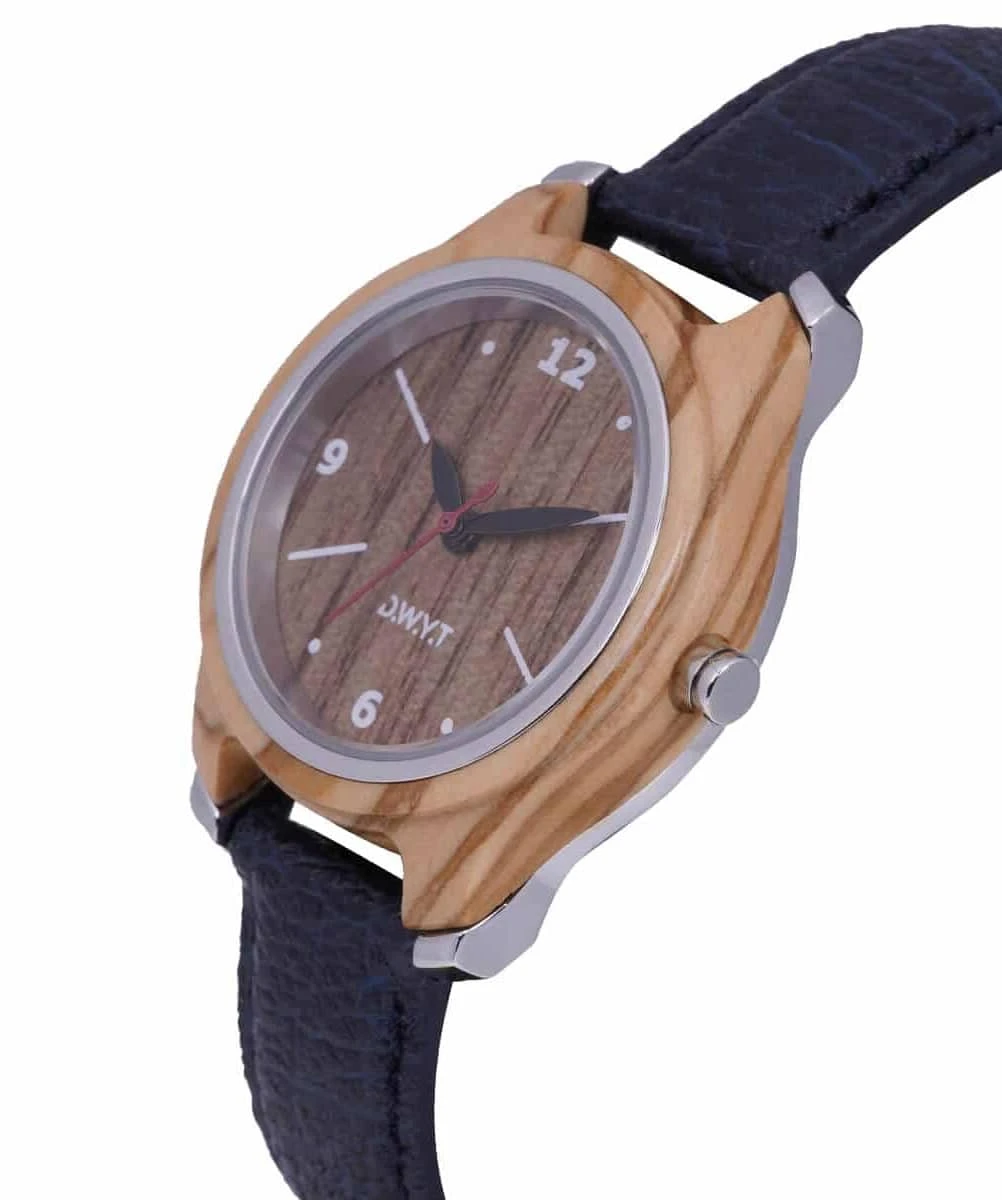 The case measures 29 mm in diameter and is made of wood. Then, The bracelet is made of blue apple leather, with a synthetic lining, and is vegan. The watch is equipped with a Ronda Swiss P. movement and comes with a 2-year warranty.