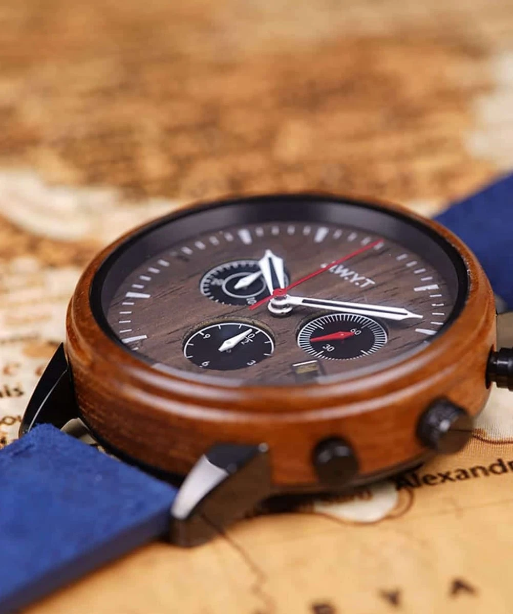 The eco-designed watch for men from the EXPLORER collection is a chronograph. Firstly, it features an interchangeable bracelet. With a diameter of 42 mm, its case is made of wood, while its bracelet is crafted from vintage sapphire blue leather.