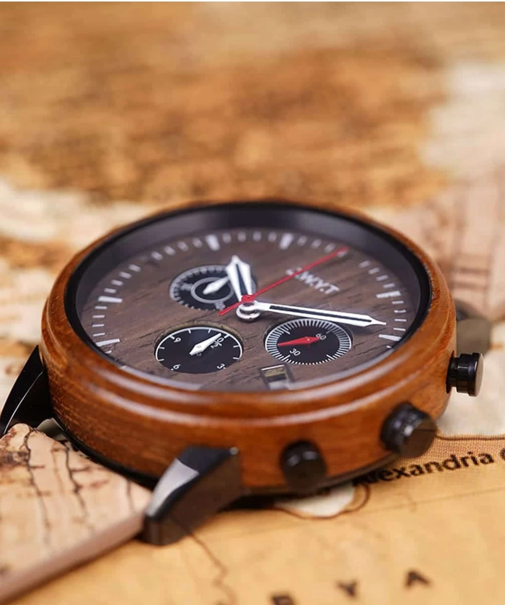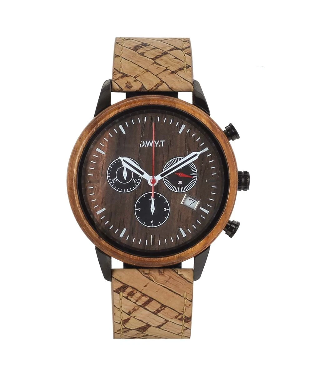 The black sandalwood dial and reinforced mineral glass give the watch an elegant and sturdy look. The cork bracelet, combined with a synthetic lining, provides optimal comfort. The closure is secured with a simple silver-colored buckle.