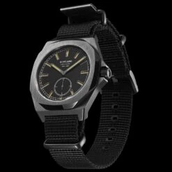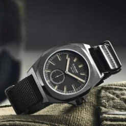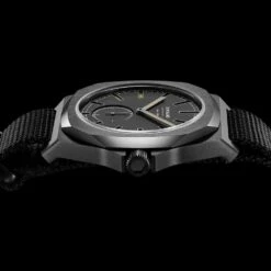Case of 38 milliliters that will fit the vast majority of wrists, this timepiece is dressed with a nylon strap bracelet, which brilliantly embellished the matte black case. The logo of the house is found in various places, including the back of the bracelet or on the buckle.