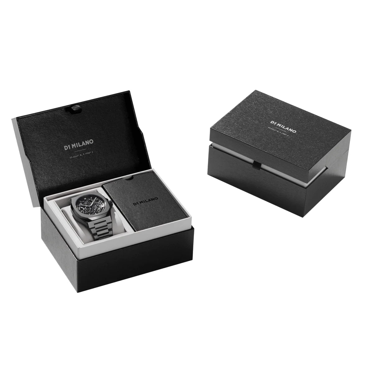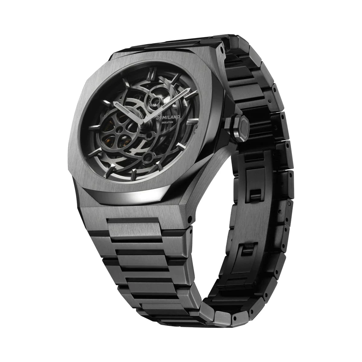 The Seiko SII NH70-L movement, Japan Made, renowned for its robustness and longevity, equips the D1 Milano Skeleton.
