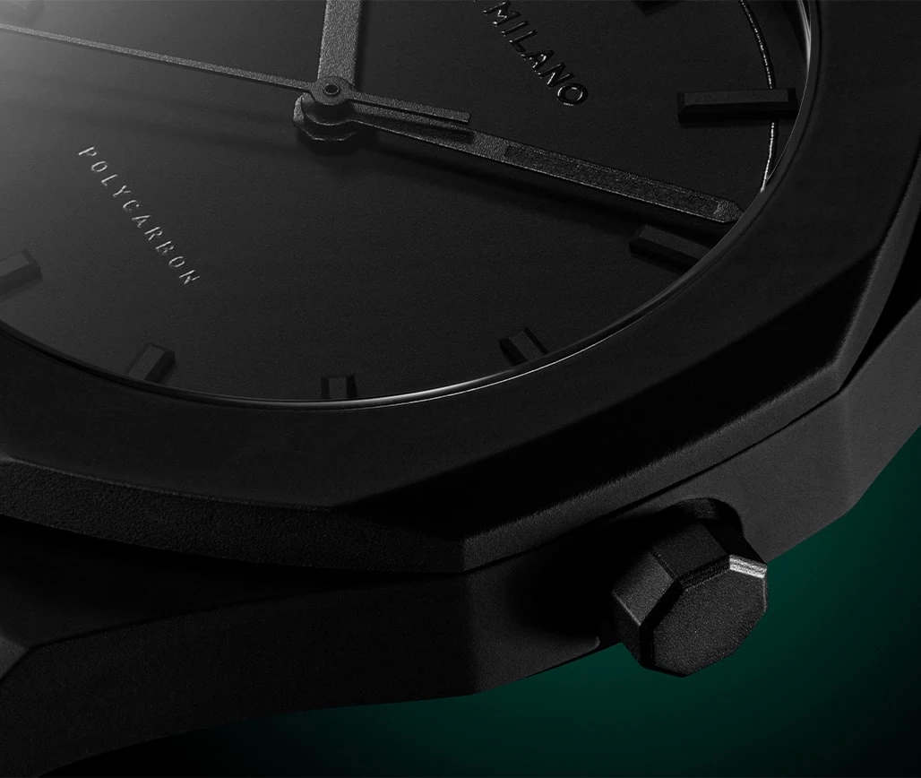 The Seiko VJ21 movement, Japan Made, renowned for its robustness and longevity, equips the D1 Milano Polycarbon