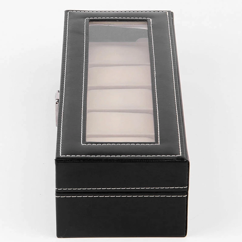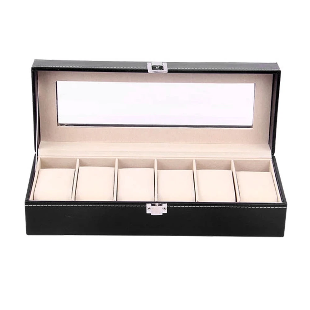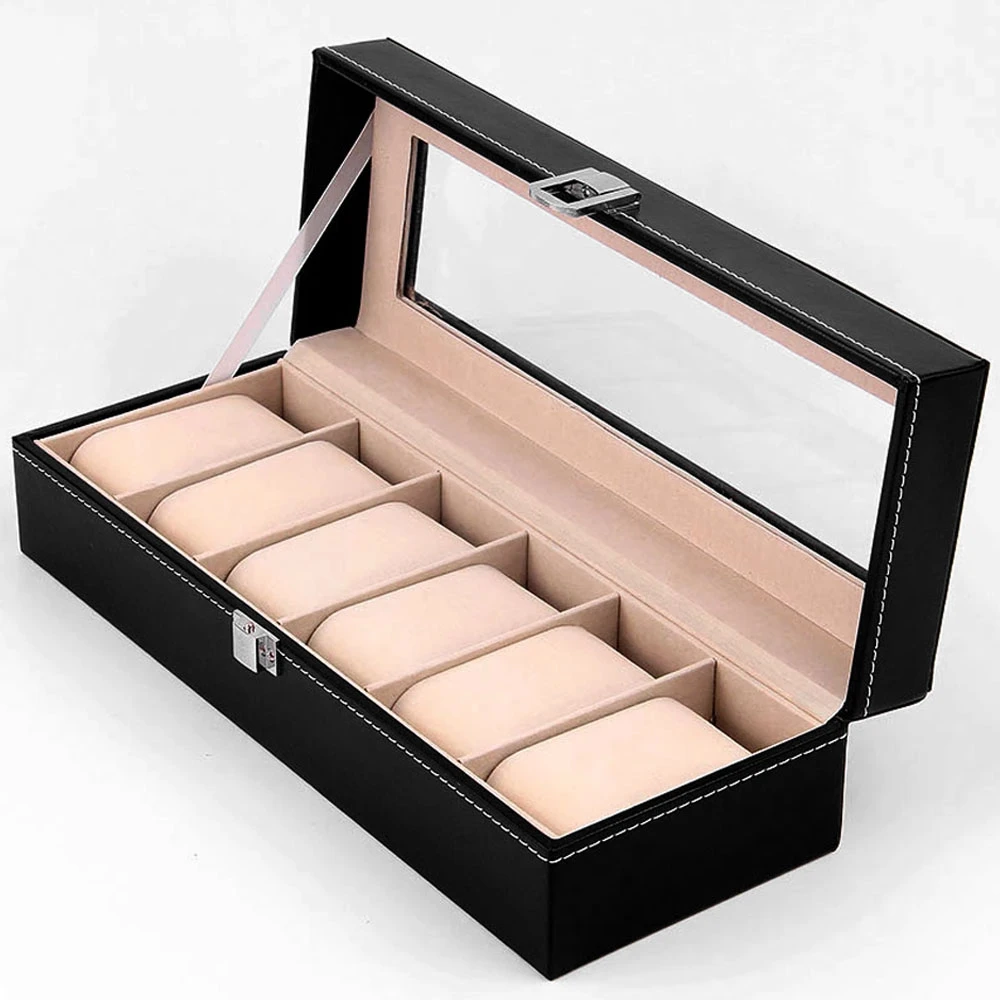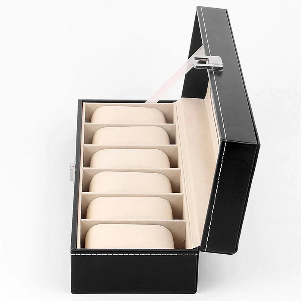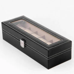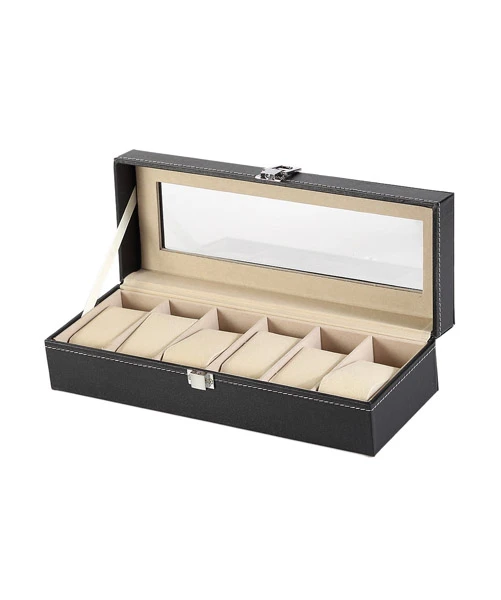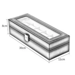 It contains 6 cases of synthetic velvet cushions that can accommodate watches of any diameter. The outer structure is covered with synthetic leather that gives it a modern look, including a metal clip closure.