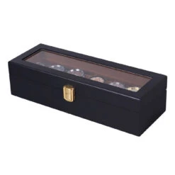 It contains 6 cases of synthetic velvet cushions that can accommodate watches of any diameter. The outer structure is covered with synthetic leather that gives it a modern look, including a metal clip closure.