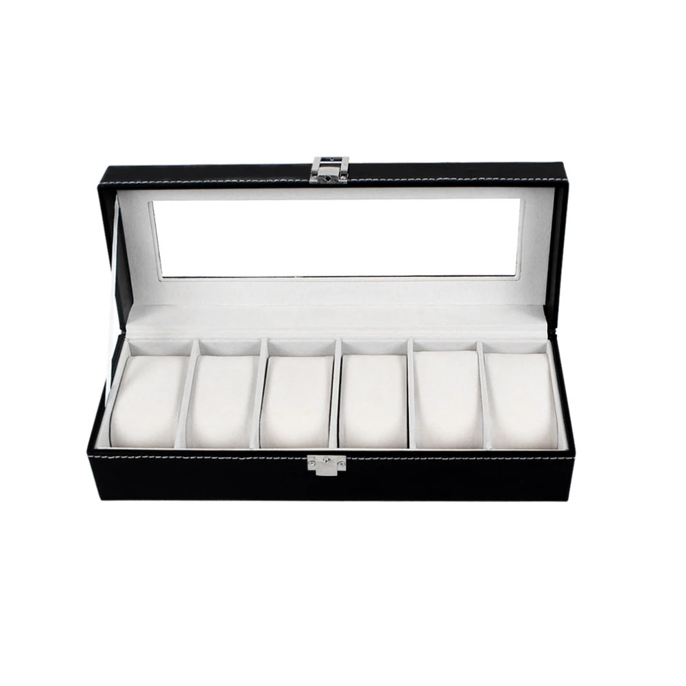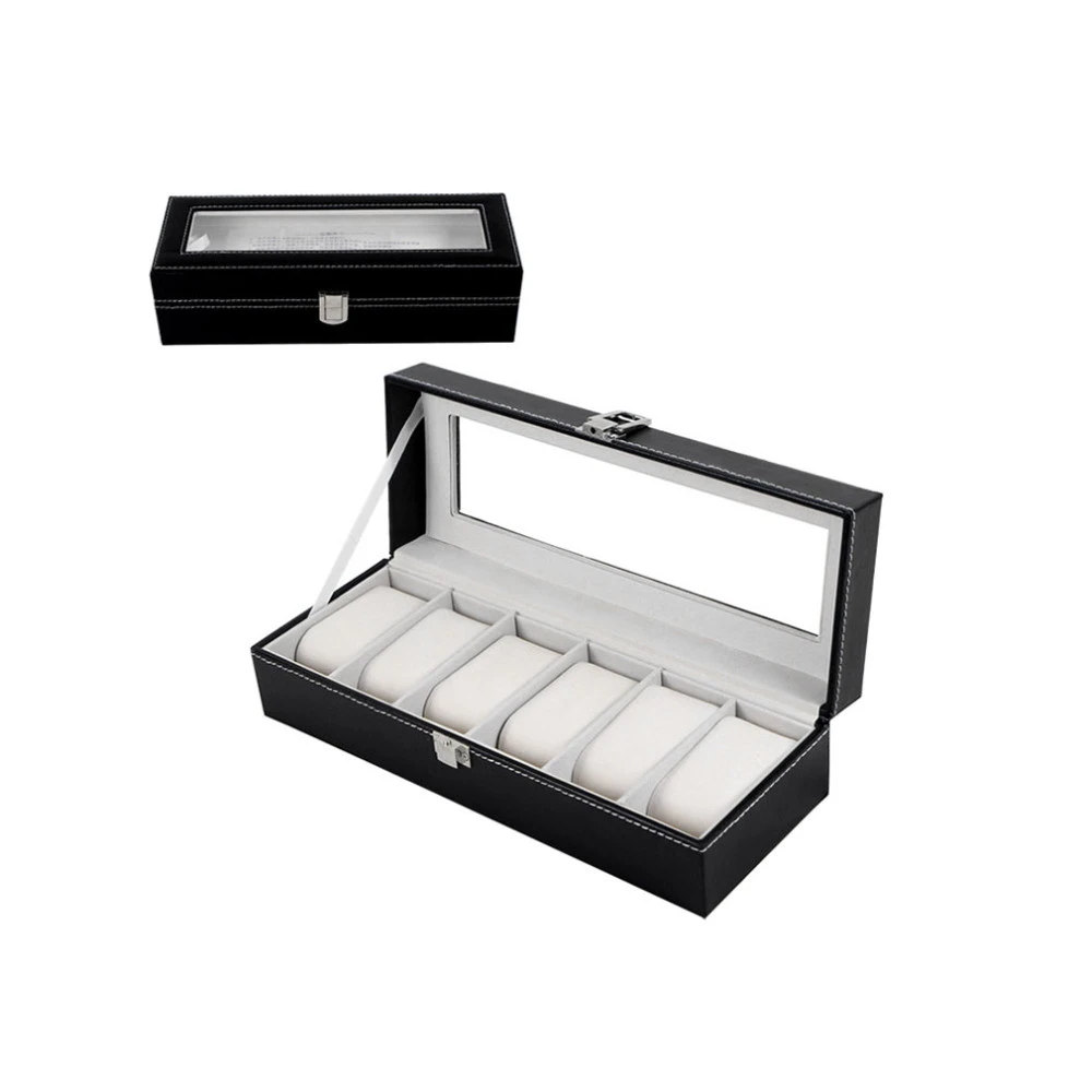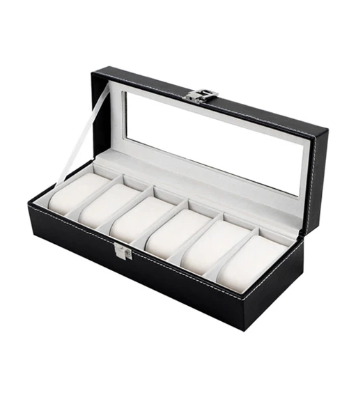 It contains 6 cases of synthetic velvet cushions that can accommodate watches of any diameter. The outer structure is covered with synthetic leather that gives it a modern look, including a metal clip closure.