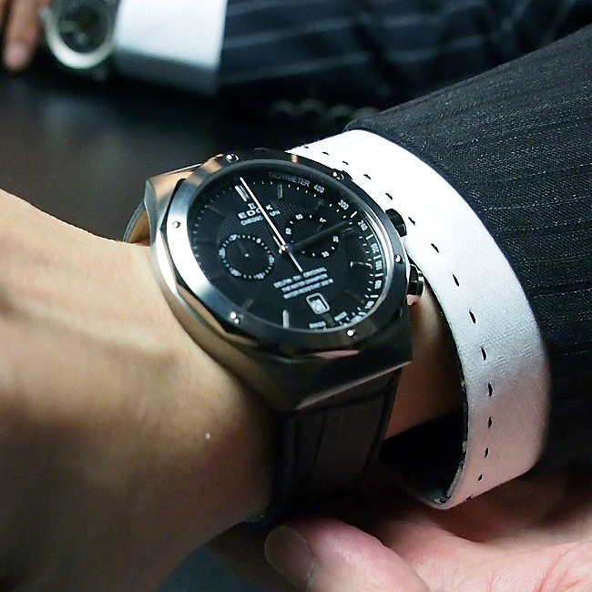 The “Black and Silver” color combination of the dial, matched with the rubber bracelet, offers a unique style to the watch, allowing it to easily slip under a traditional “Shirt / Tie” outfit, or in more casual conditions, in the evening or weekend for example.