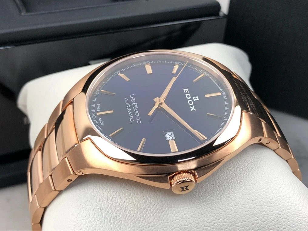 The chic, elegant look of this watch is probably due to the tasteful use of colors. The rose gold color of the case contrasts finely with the sumptuous midnight blue of the dial and strap. The same rose gold color used to mark the hour-markers makes the dial highly legible.