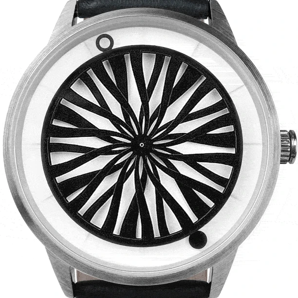 Using three sculpted discs instead of two, this design allows for more variation across time. Patterns change in symmetry and size as the hour and minute discs move across one another. We are inspired by the potential of using time’s movement to create visual beauty, and perhaps even philosophical meaning. We want to create kinetic sculptures for your wrist.