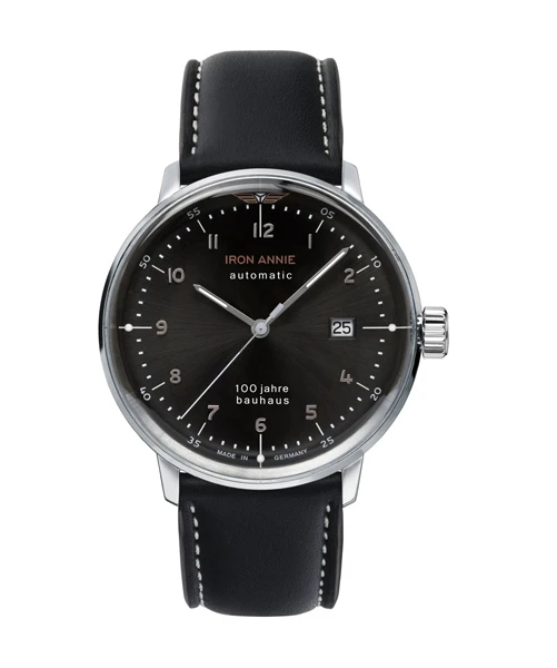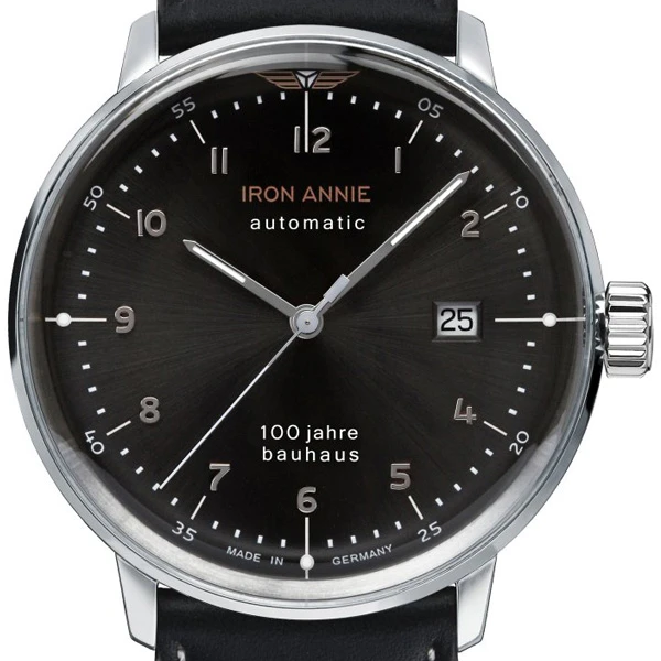 The SELLITA SW200 movement, Swiss Made, renowned for its strength and longevity, equips the Iron Annie Bauhaus model. Possessing 25 jewels, it has a date complication at 3 o’clock and a 40-hour of power reserve.