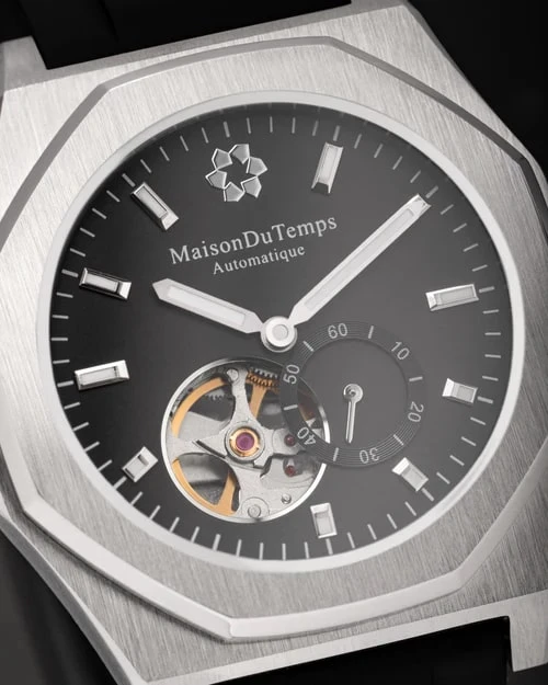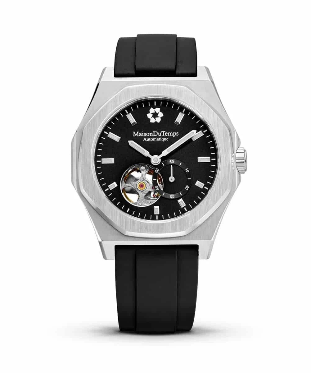 The MAISON DU TEMPS MTDelta Open Heart Black Rubber Black is a masterpiece of horological engineering. Crafted with precision, this timepiece embodies the perfect balance between modern technology and timeless elegance. The skeletonized design reveals the intricate mechanics within, offering a glimpse into the heart of the watch.