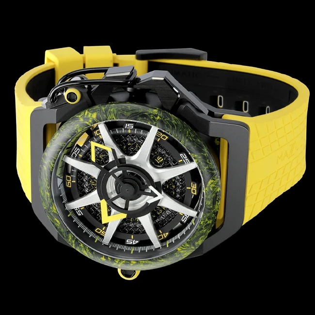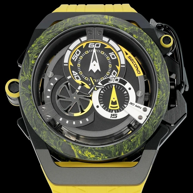 Thanks to an innovative industrial mechanism that allows it to switch from a sporty and elegant watch to a sophisticated chronograph with a click, the Mazzucato RIM Monza Watch instantly adapts to your style of the moment. Characteristic of Italian design, it never goes unnoticed and resolutely asserts itself as a mark of character and distinction, with its dial inspired by the automotive world and its colored clasp in the shape of a clip.