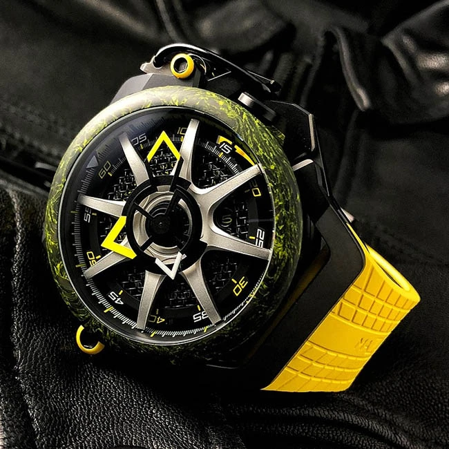 Version displaying the time, the dial of the RIM monza mazzucato watch is resolutely inspired by a racing car wheel, with rim and spokes.