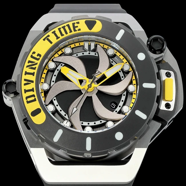Version displaying the time, the dial of the RIM Scuba mazzucato watch is resolutely inspired by a racing car wheel, with rim and spokes.