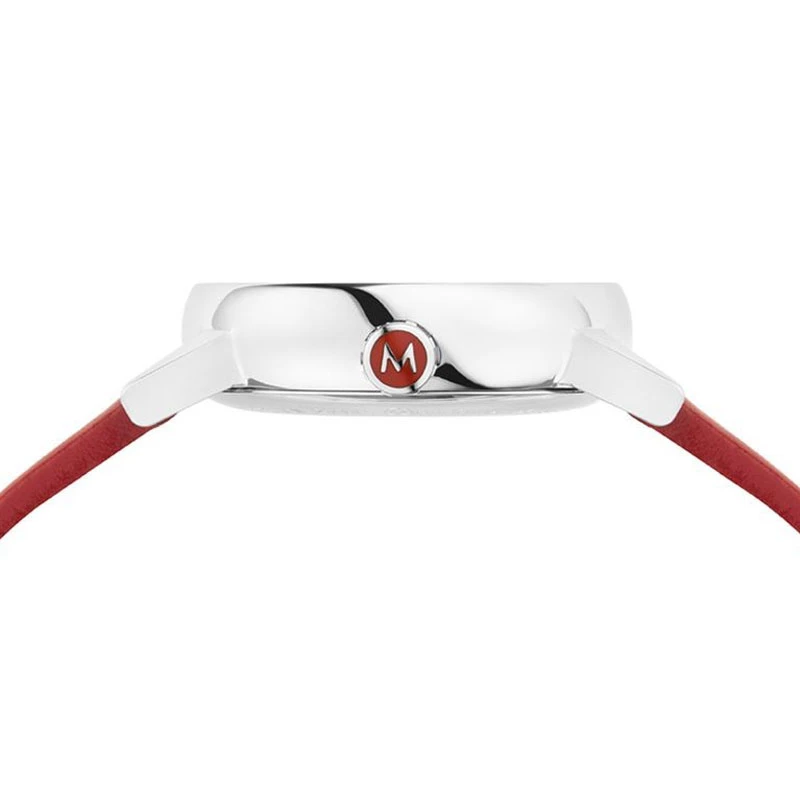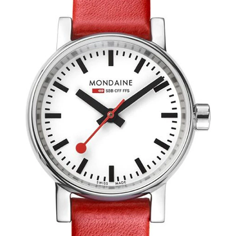 Countless small details come to sublimate this elegant jewel. Let’s start with the crown, cleverly tinted with red and decorated with the Mondaine logo.