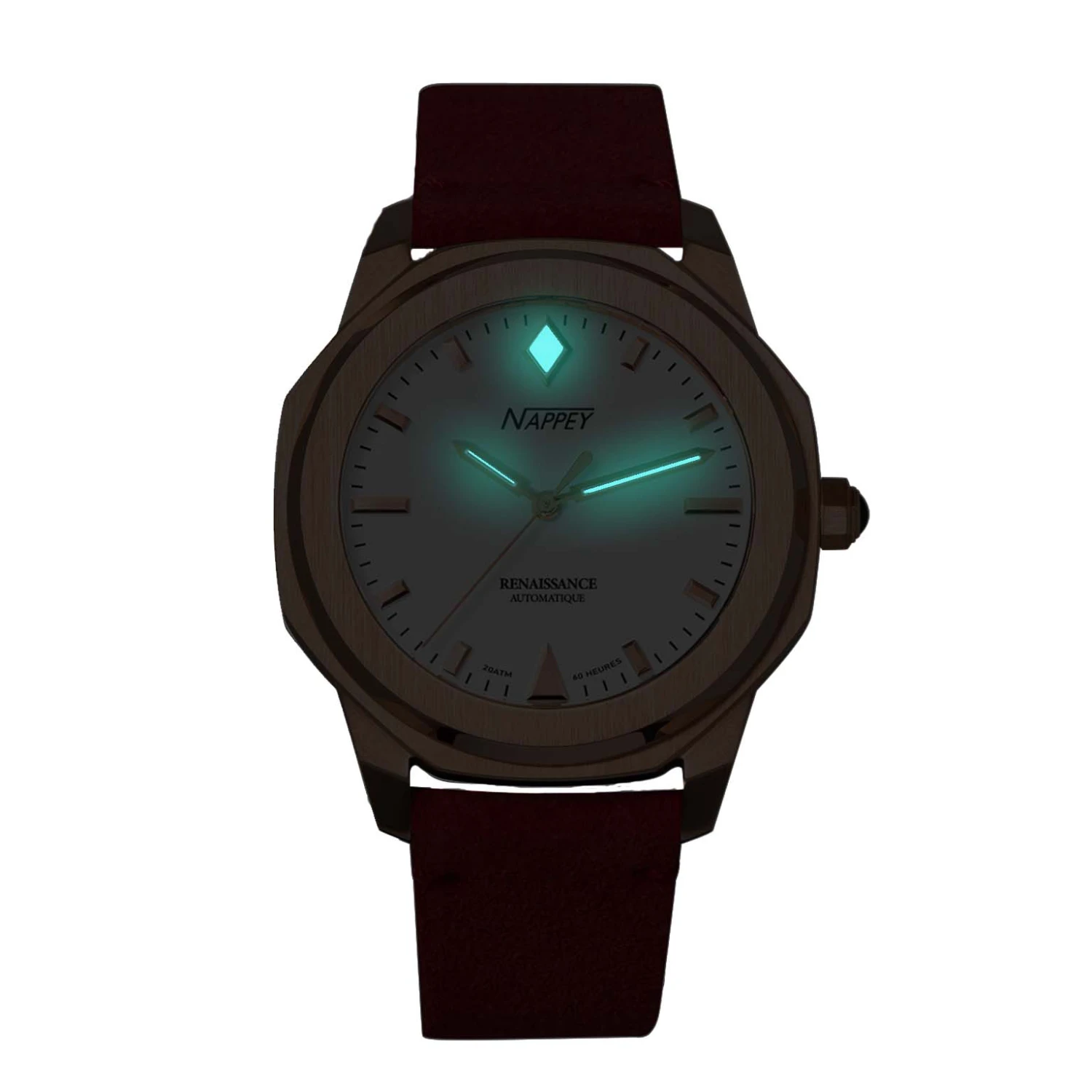 Also, the Nappey logo is found in various places, including the back of the strap or on the pin buckle. Finally, the screwed crown located at 3 o’clock, with its perfect shape, takes up the hexagonal features of the case and allows the manual winding of the watch as well as its setting of the time. A subtle detail, this crown is cleverly decorated in black, matching the color of the case.