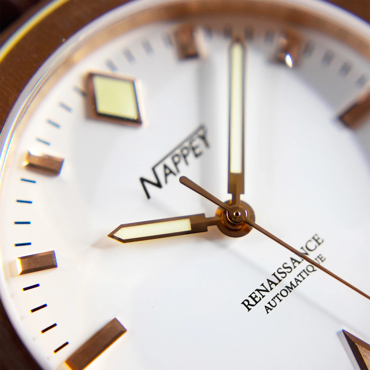The MIYOTA 8315 movement, made in Japan and known for its robustness and longevity, powers this Nappey Renaissance watch. With 21 jewels, it has an exceptional power reserve of 60 hours.