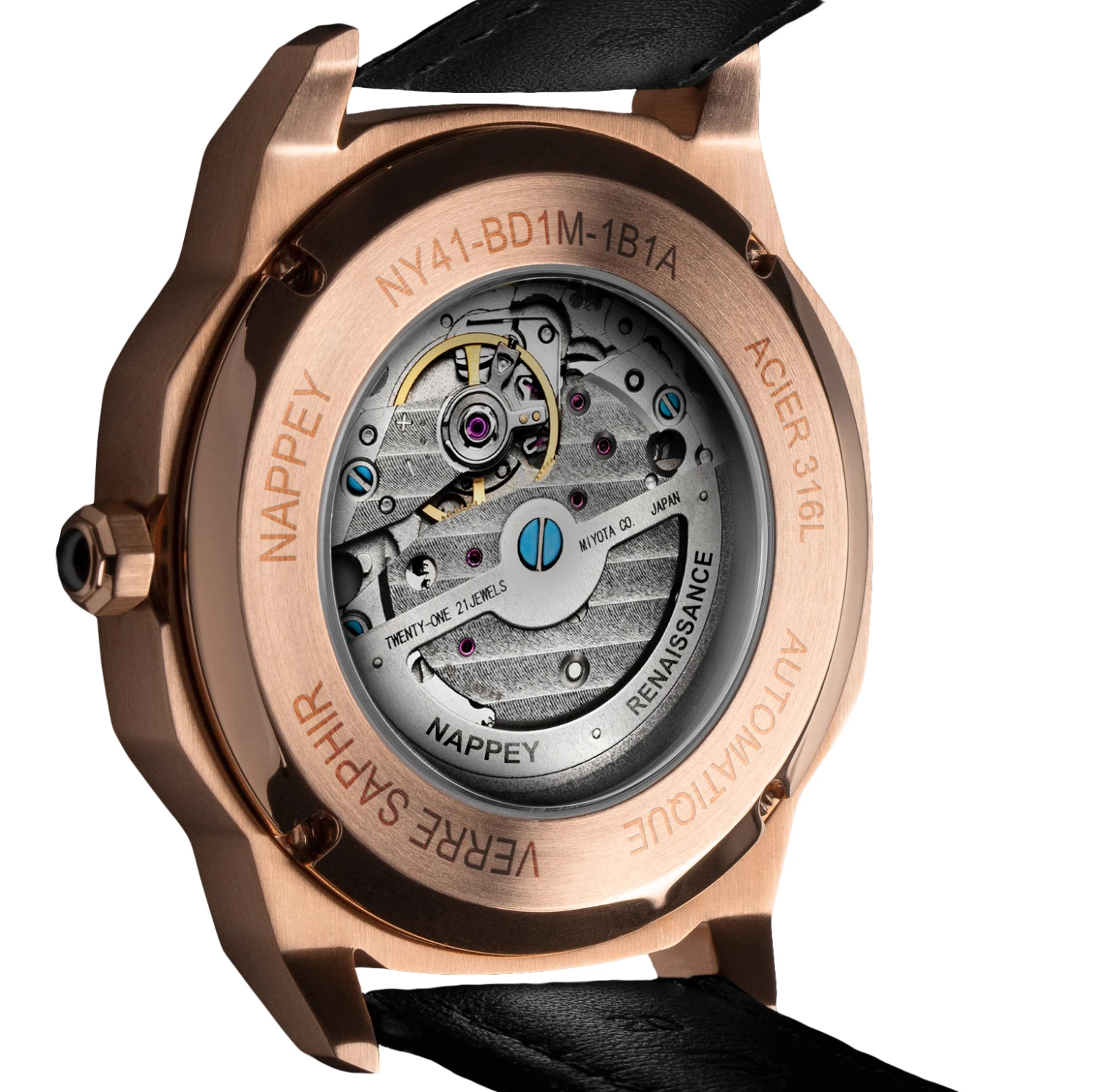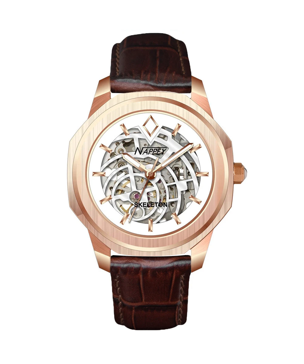 The MIYOTA 8N24Â movement, made in Japan and known for its robustness and longevity, powers this Nappey Skeleton watch. With 21 jewels, it has a high quality power reserve of 40 hours.