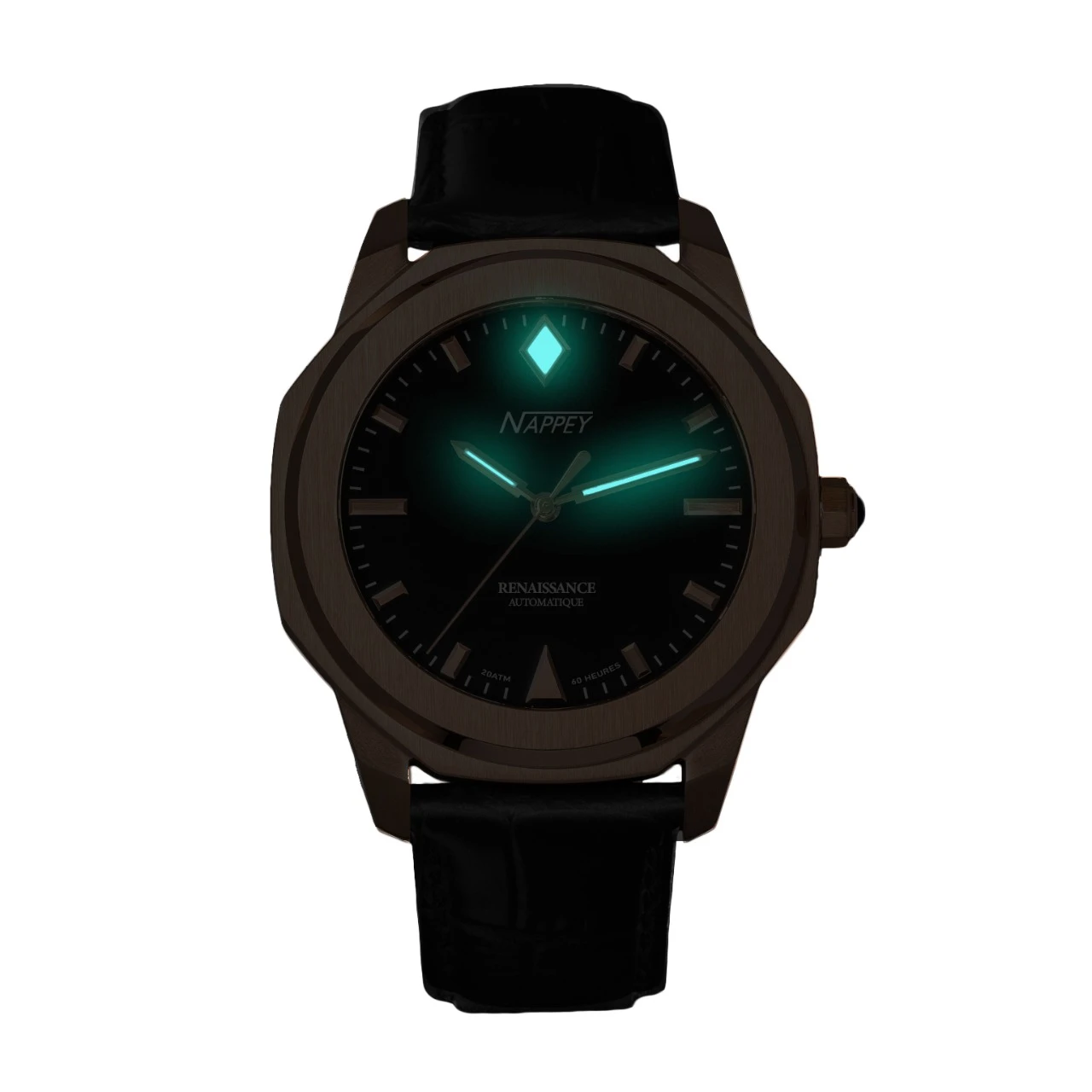 Also, the Nappey logo is found in various places, including the back of the bracelet or on the pin buckle. Finally, the screwed crown located at 3 o’clock, with its perfect shape, takes up the hexagonal features of the case and allows the manual winding of the watch as well as its setting of the time. A subtle detail, this crown is cleverly decorated in black, matching the color of the case.