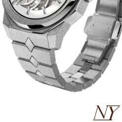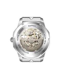 Also, the Nappey logo is found in various places, including the back of the bracelet or on the pin buckle. Finally, the screwed crown located at 3 o’clock, with its perfect shape, takes up the hexagonal features of the case and allows the manual winding of the watch as well as its setting of the time. A subtle detail, this crown is cleverly decorated in black, matching the color of the case.