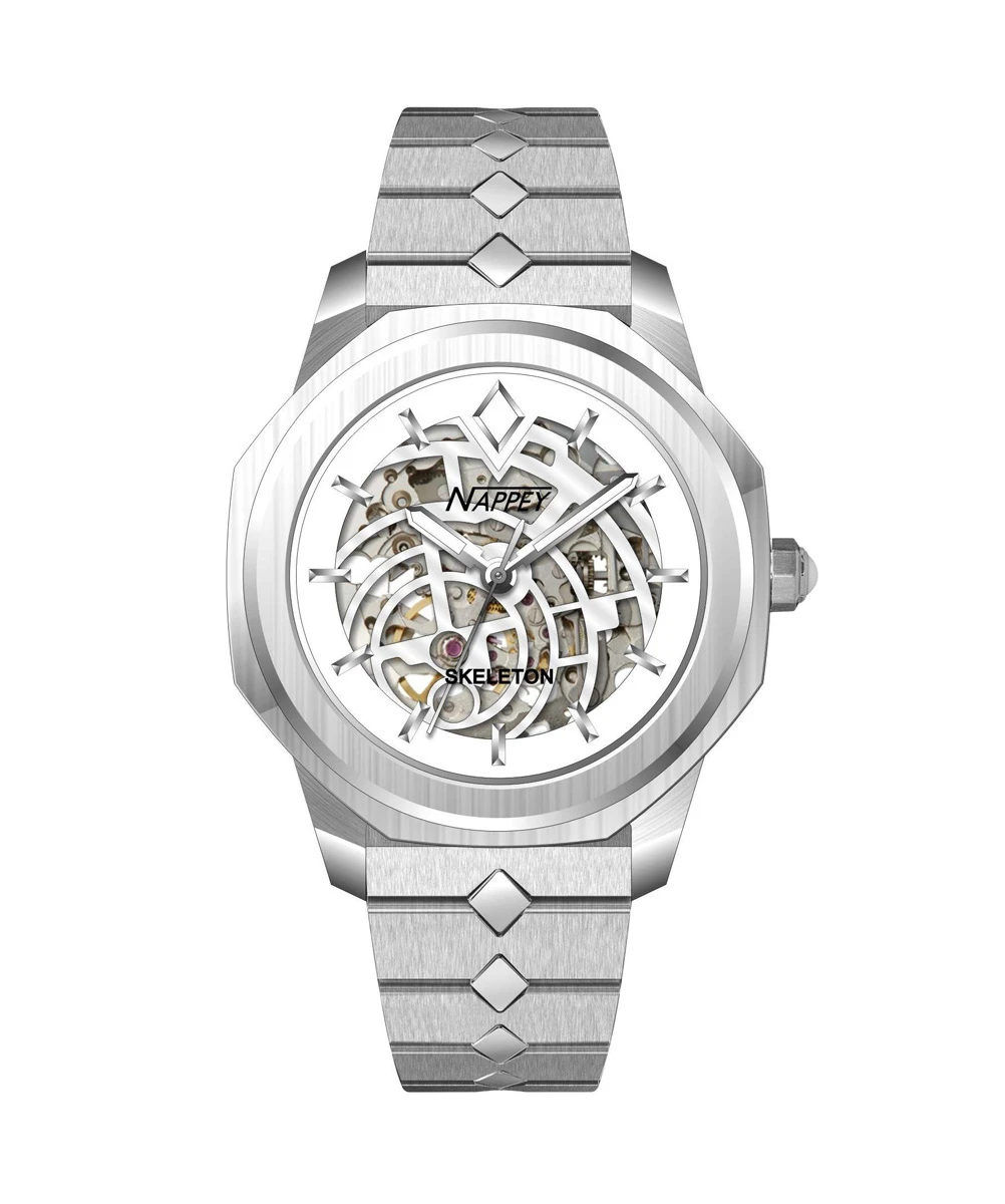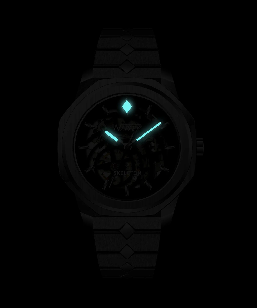 The MIYOTA 8N24 movement, made in Japan and known for its robustness and longevity, powers this Nappey Skeleton watch.