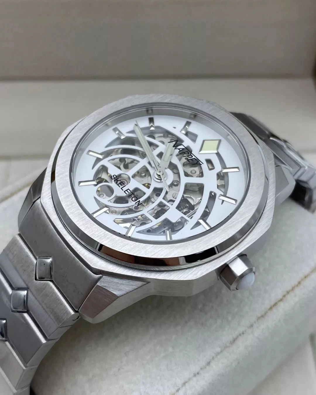 The first skeleton watch with a sapphire crystal glass to be added to our catalog, the Nappey Skeleton has a marine-grade “8N24” stainless steel case: this steel provides one of the best strength-to-weight ratios on the watch market.