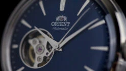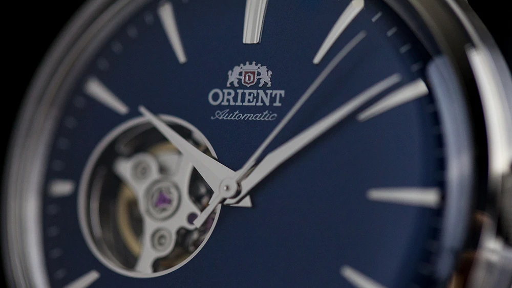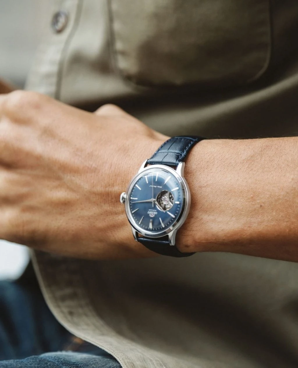 Semi-skeleton dial, almost minimalist, unique mirror effect due to the special treatment of the blue dial, mineral glass dome making the Bambino Collection so recognizable, the look of this automatic is surely one of the most successful of the range “Classic” from Maison Orient …