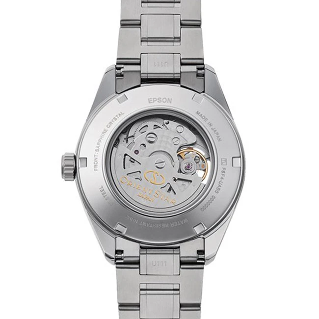 - Crown, oscillating weight and clasp engraved with “Orient Star” logo.