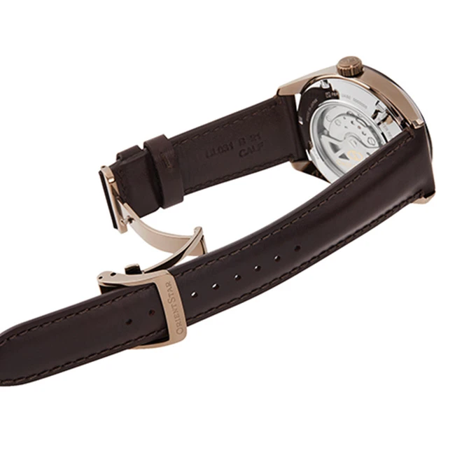 - Crown, oscillating weight and clasp engraved with “Orient Star” logo.
