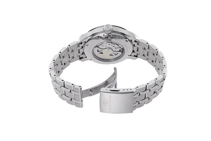 - Crown, oscillating weight and clasp engraved with “Orient Star” logo.