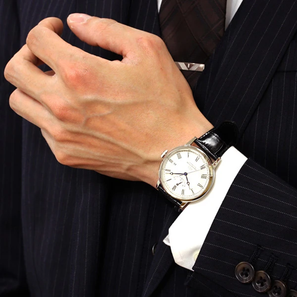 Dome glass, curved hands, power reserve indicator and date at 3 o’clock fit together with elegance and perfection.