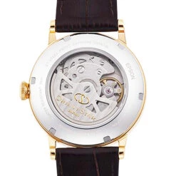 Its white dial is matched with a brown bracelet. This finesse and this sense of detail are also found with great art in two very distinct places; the crown is engraved with the Orient Star logo as well as the rotor, which can be seen on the back of the watch. All the cogs have a common characteristics: they are all made in a unique place, Japan.