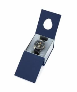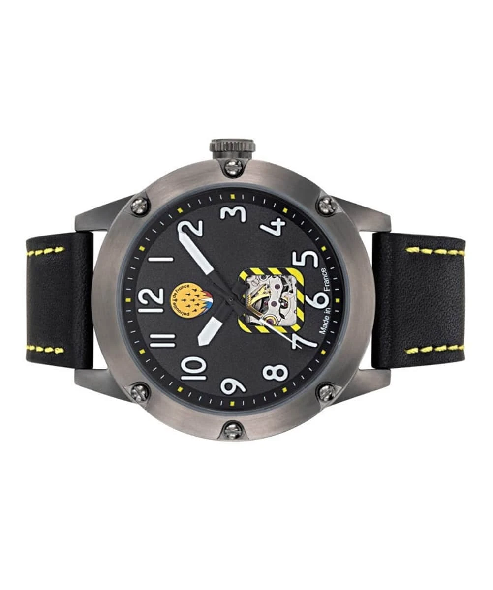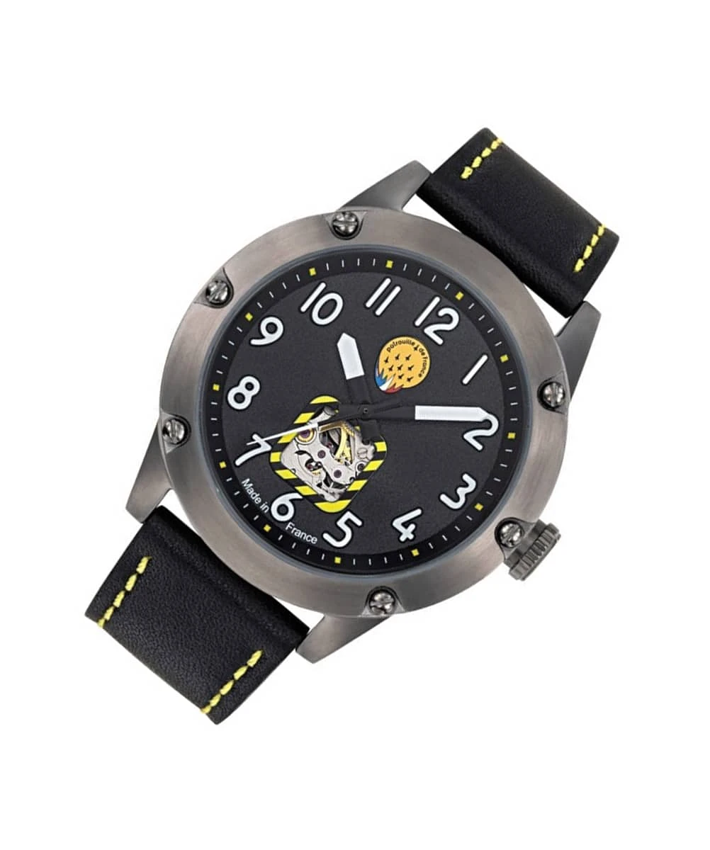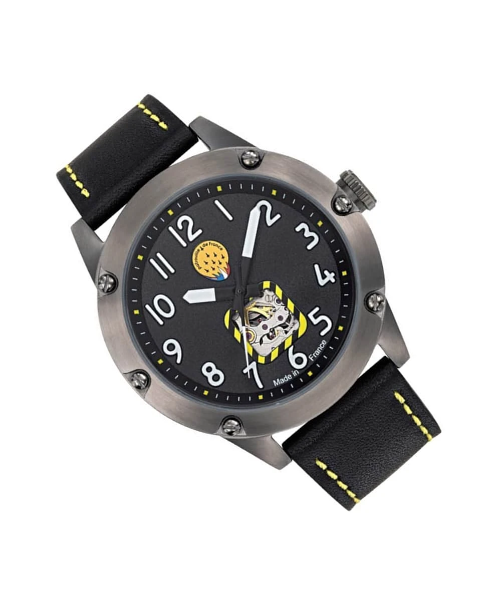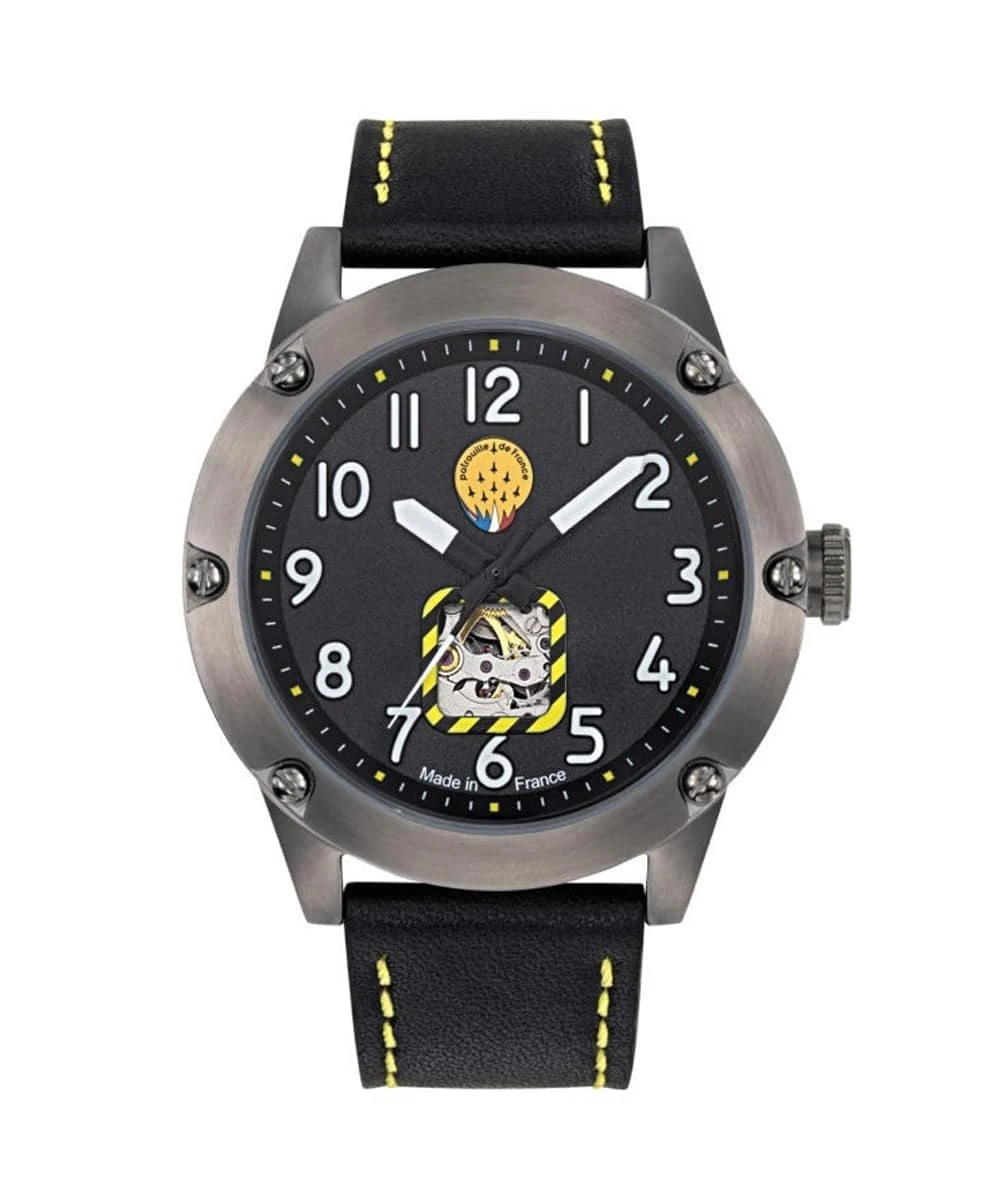 The caseback is engraved with the official logo of the Patrouille de France, adding an exclusive touch to this exceptional piece. The unidirectional rotating bezel, reminiscent of an altimeter, reinforces the aeronautical character of the watch, while the premium leather strap ensures optimal comfort and increased durability.