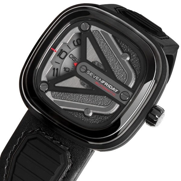 The dial of the M3/01 is inspired by spaceships. It is made of stainless steel, and has six levels of grey, matte black, brushed discs and one of the discs is made of rhodium, a non-radioactive chemical component.