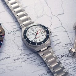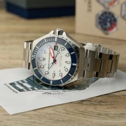 Measuring 44mm in diameter and 15mm in thickness, the watch offers 300m water resistance in a relatively compact marine grade stainless steel body. The scratch-resistant sapphire crystal lens offers durability and clarity of vision.