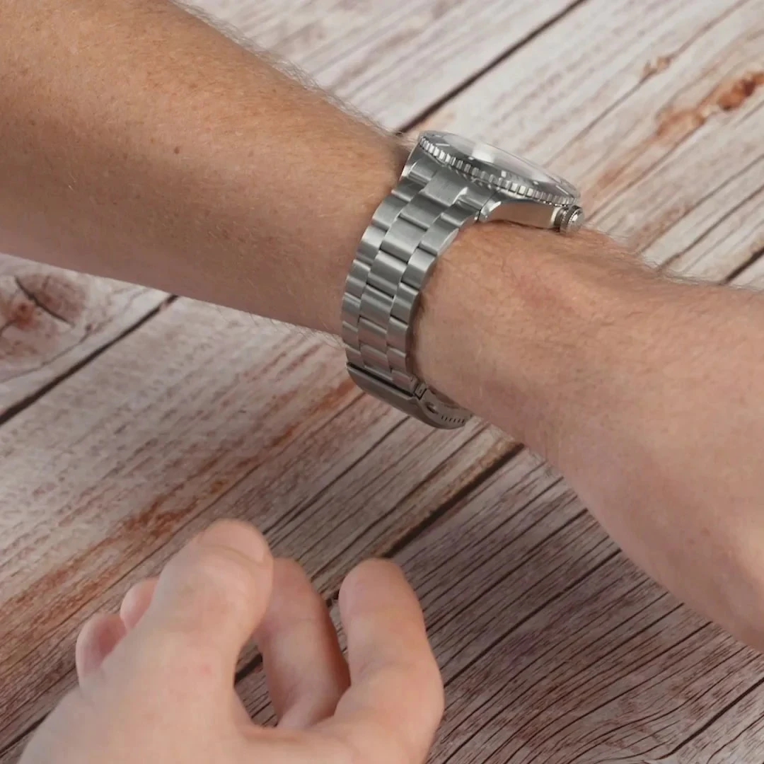 Equipped with a screw-down crown, the waterproof case at 300 meters ensures impermeability. Displaying the date at 3 o’clock is a subtle but still useful complication.