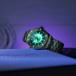 The hardened mineral glass prevents a tarnished surface and ensures quality visibility. The waterproof case at 300 meters has a transparent caseback, offering an unobstructed view of the rotor and the rest of the Japan Miyota 9039 Automatic With 3 Hands Date movement