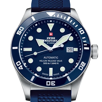 This Swiss Military by Chrono Dive Watch SMA34075-07 with ceramic bezel is a concentrate of mechanical technology backed by a unique style and design. Equipped with a rugged case 14 mm thick and 44 mm in diameter, and an exceptional waterproofness of 500 meters, this timepiece will please fans of fine watchmaking … And scuba diving.