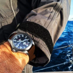 This watch has a case size of 42 millimeters that will fit the vast majority of wrists. This timepiece dressed with a leather bracelet, which brilliantly embellishes the silver case, as well as a blue back.