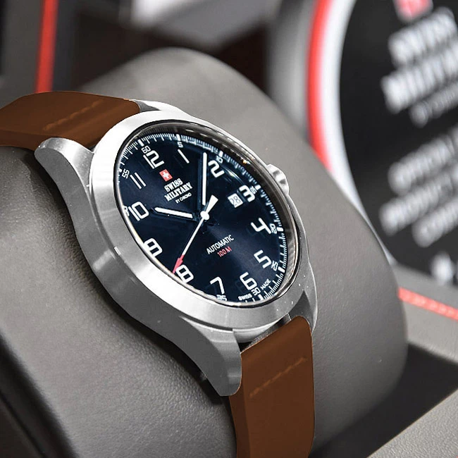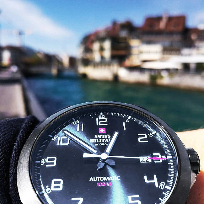 - 100 meters of water resist (10 ATM),saphir glass, transparent case back and a price defying all competition. Our customers have dreamed of it, the teams of the Swiss Military workshop have done it!