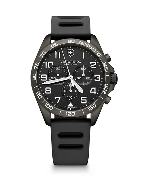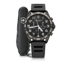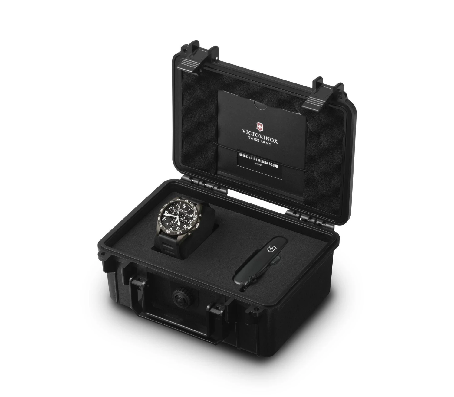 Sporty and distinctly edgy: meet our new FieldForce Sport Chrono. A study in monochrome, its design DNA not only looks super fresh but is also a high functionality win. The matte PVD case and bezel add to its dark allure and are the ideal setting for the bright hands and numerals with SuperLuminova® luminescent technology for 24/7 readability. To push the limits even further, the watch comes in a set with an exclusive Spartan PS knife with matte handles. A sporty, strong and iconic combo.